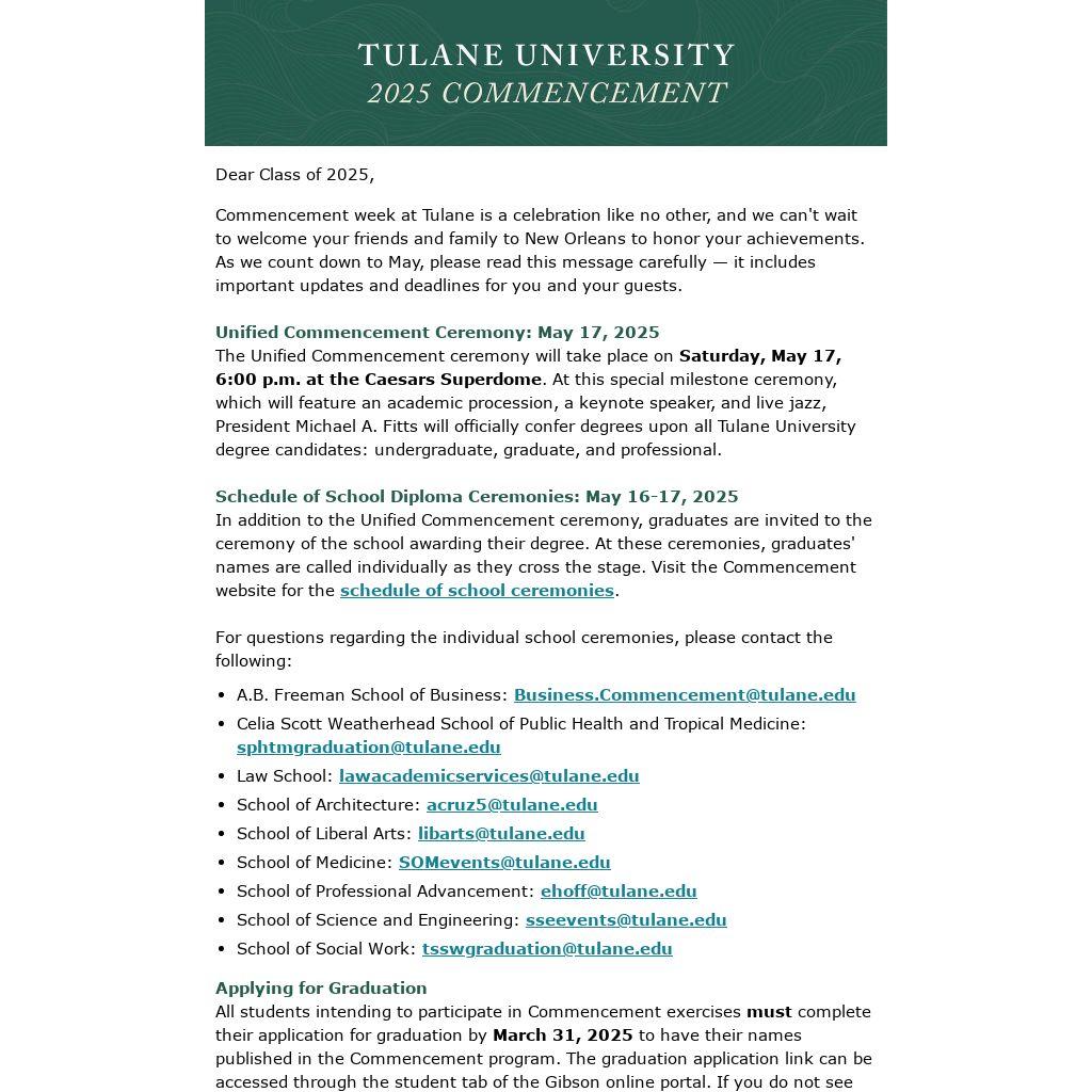 Commencement week at Tulane is a celebration like no other, and we can't wait to welcome your friends and family to New Orleans to honor your achievements. As we count down to May, please read this message carefully — it includes important updates and deadlines for you and your guests.