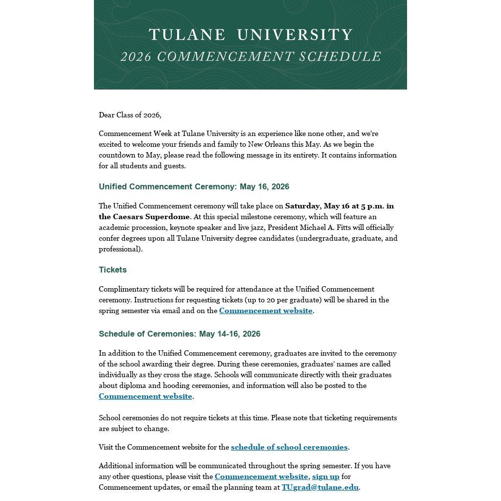 Additional information will be communicated throughout the spring semester. If you have any other questions, please visit the Commencement website, sign up for Commencement updates, or email the planning team at TUgrad@tulane.edu.