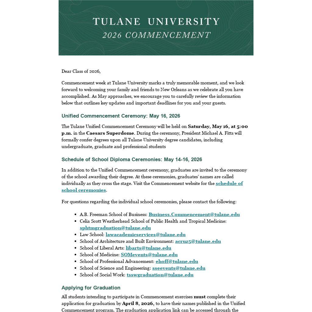 Commencement week at Tulane University marks a truly memorable moment, and we look forward to welcoming your family and friends to New Orleans as we celebrate all you have accomplished. As May approaches, we encourage you to carefully review the information below that outlines key updates and important deadlines for you and your guests.