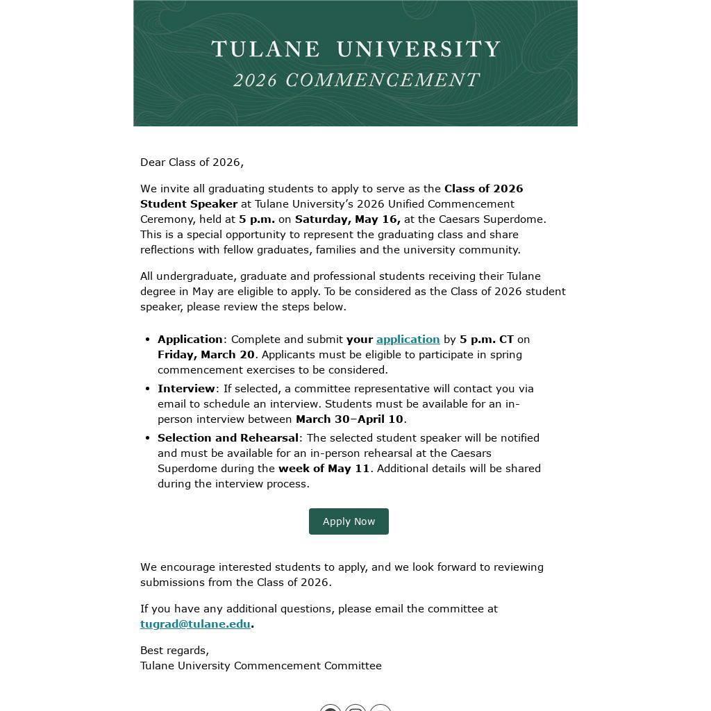 We invite all graduating students to apply to serve as the Class of 2026 Student Speaker at Tulane University’s 2026 Unified Commencement Ceremony, held at 5 p.m. on Saturday, May 16, at the Caesars Superdome. This is a special opportunity to represent the graduating class and share reflections with fellow graduates, families and the university community.